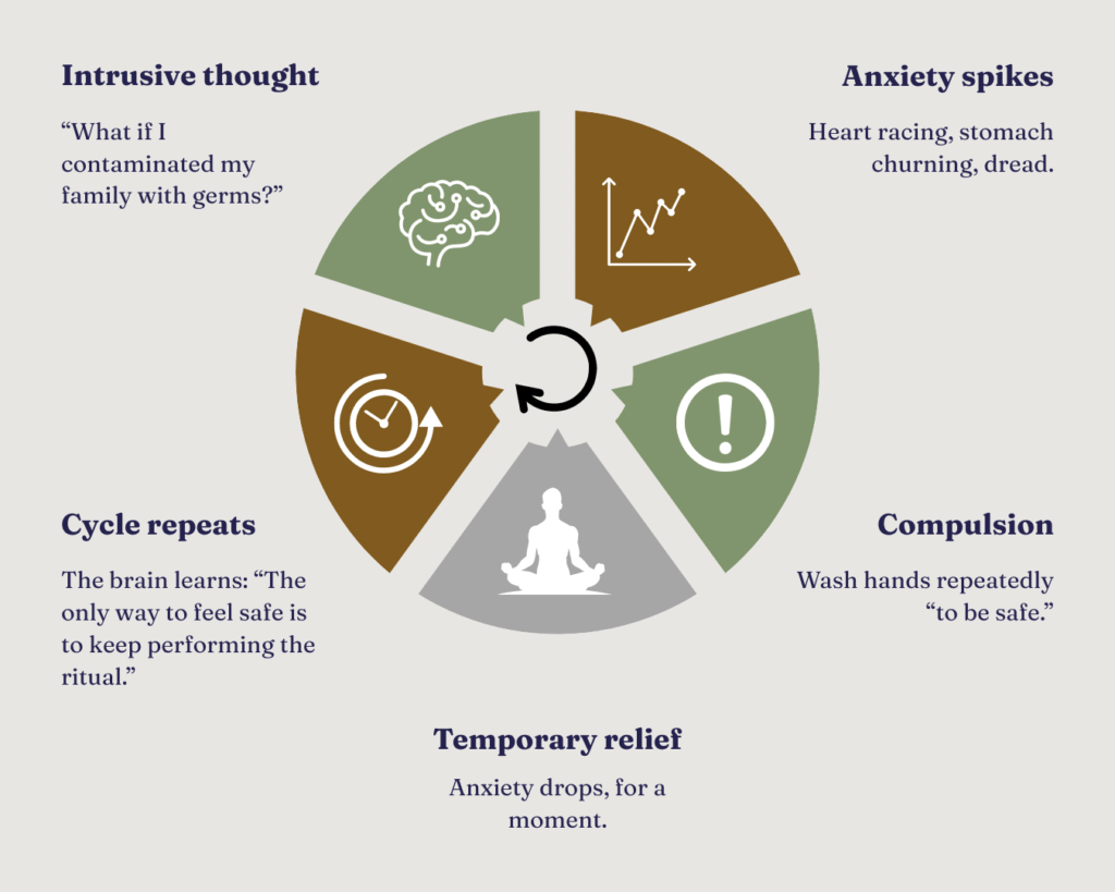 OCD is driven by fear and uncertainty, not preference or personality. A person with OCD doesn’t wash their hands excessively because they like cleanliness. They wash because a part of their brain tells them: